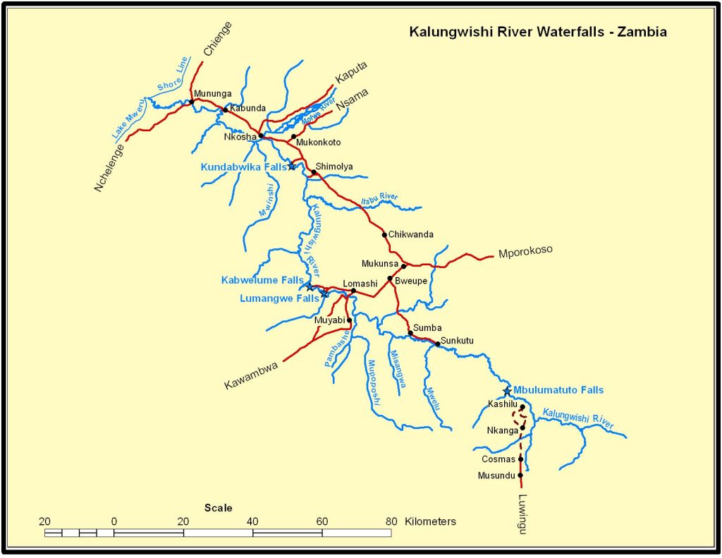 The Kundabwika Falls lies on the Kalungwishi River, the boundary between Nchelenge and Kaputa districts. It’s 4.3Km off the Mununga Mporokoso road at a point 38Km south east of Mununga and 46Km north west of Mukunsa on the Kawambwa Mporokoso Road.